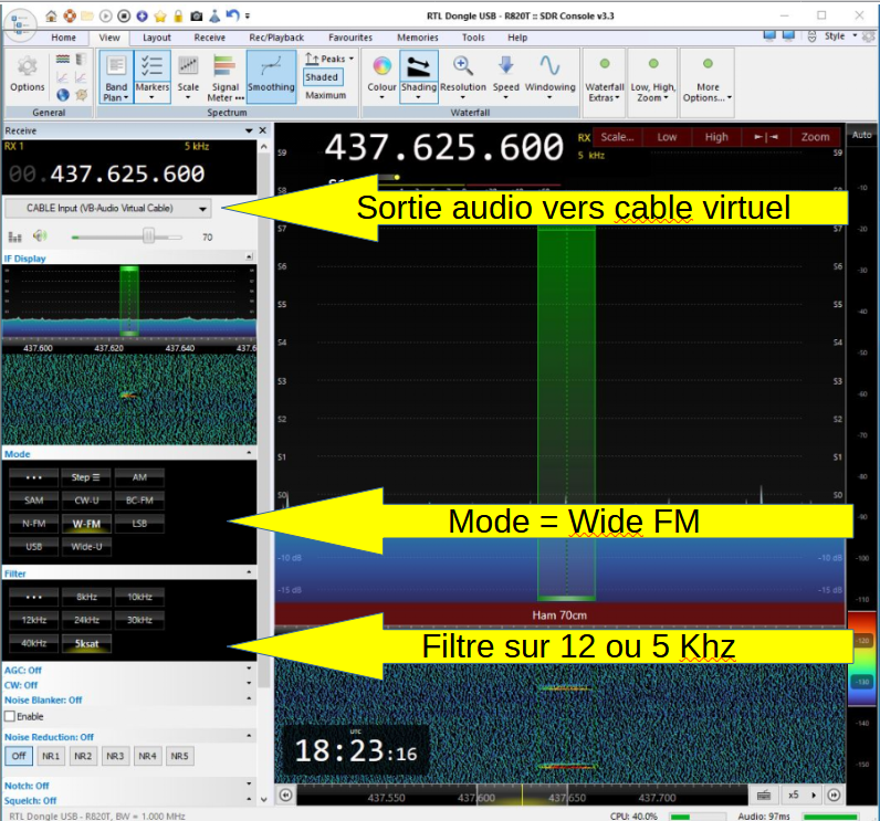 Pour les programmes de réception SDR vous devez installer un câble virtuel c’est par ici https://vb-audio.com/Cable/ qui permet de réinjecter la sortie audio de la partie réception vers l’entré du logiciel de décodage.