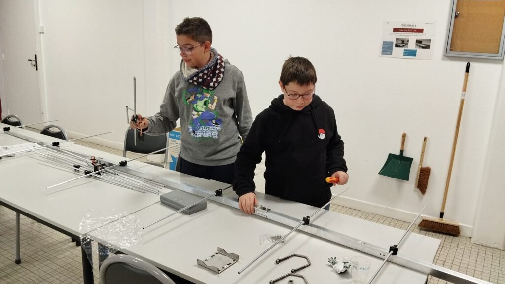 Théo aux notices et Maxime aux tournevis ! Assemblage des moteurs, ils permettront d’orienter les antennes afin de « poursuivre » l’ISS lors des minutes de son passage au dessus de l’Europe de l’ouest.