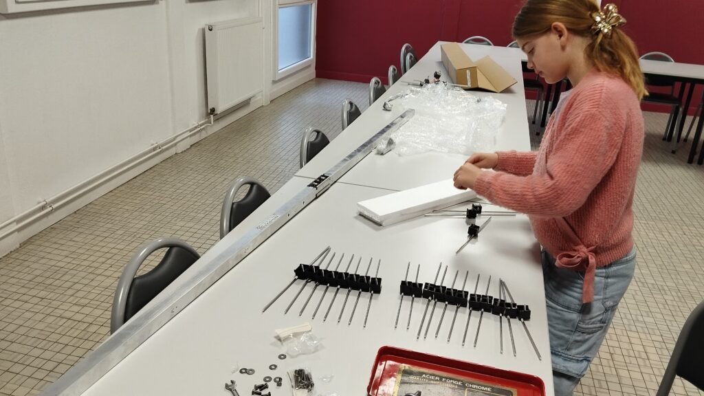Pendant que les garçons assemblent l’antenne 144Mhz , Apolline prépare l’antenne 2×15 éléments croisés pour le 432Mhz (la bande radioamateur des 70 cm)